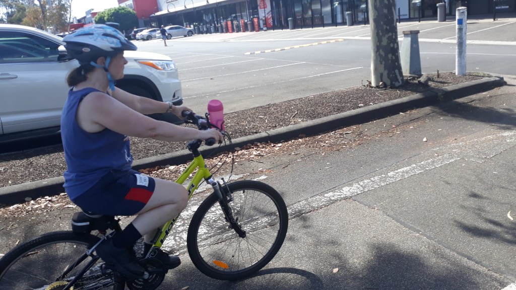 Then it was a 3.5 km ride back. A more confident rider now, Amanda crossed very busy Whitehorse Rd, on her bike, at the traffic lights to enter the car park opposite with a lane to the nearby shared path. Then it was a lovely ride along the rail trail back home.